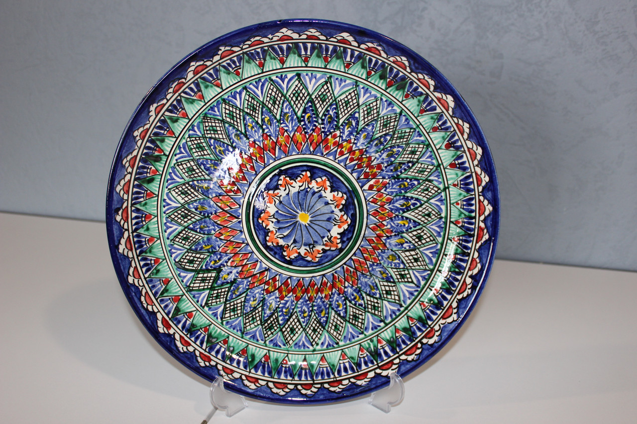 Узбекская посуда расписывается вручную, благодаря чему купив ляган для плова, Вы получаете в свое распоряжение уникальное и самобытное блюдо.Тарелка с таким орнаментом неизменно вызывает восхищение. Сервировка любой закуски неизменно получится, ведь размеры тарелки позволяют уложить здесь и овощи, и мясо, и сыры. Национальный колорит лишь придает пикантности.